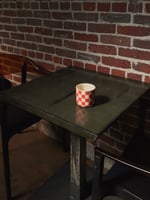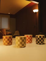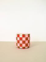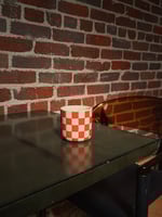 A SHORTER SIGNATURE CHECKERED CUP WITH A WHITE SPECKLED BODY, HAND-PAINTED RED CHECKERS, & A GLOSSY FINISH.